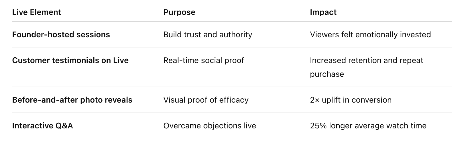 Viewers didn’t just buy the product — they rooted for the brand. The combination of transparency, founder relatability, and visible results made the Live go viral.